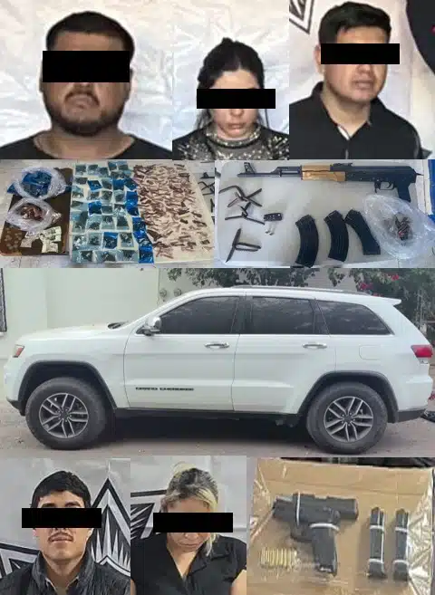 En una acción distinta, también en Cajeme, la Policía Estatal aprehendió a Kevin “N”, de 25 años, y a Milagros “N”, de 37 años, por la portación de un arma de fuego marca Taurus calibre 9 milímetros, con su respectivo cargador abastecido con ocho cartuchos útiles. Además, se aseguraron 20 envoltorios de una sustancia con características similares al cristal. El aseguramiento se efectuó en la colonia Misión del Sol II.