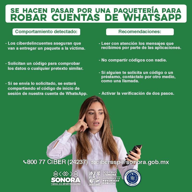 Hermosillo, Sonora, 21 de febrero de 2024.- Para prevenir que la ciudadanía sea objeto de robo de cuentas de Whatsapp, la Unidad Cibernética de la Secretaría de Seguridad Pública (SSP) de Sonora, advirtió que ciberdelincuentes se hacen pasar por empresas de paquetería con el uso de ingeniería social.