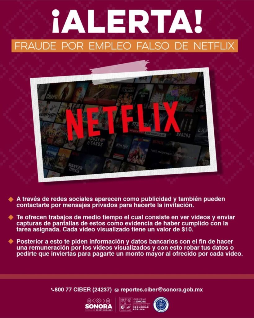 Hermosillo, Sonora.- En labores de ciberpatrullaje en redes sociales, el Gobierno de Sonora identificó una nueva modalidad de fraude que oferta empleos falsos en nombre de la empresa Netflix, por lo que comparte recomendaciones para evitar ser víctima de este tipo de delitos.