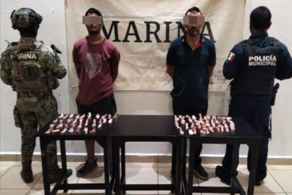 Elementos de la Policía Municipal e infantes de la Secretaría de Marina-Armada de México y oficiales de la Policía Estatal de Seguridad Pública lograron el aseguramiento de dos hombres con dosis de crystal; mismos sujetos son investigados por la ola de robos registrados en San Carlos