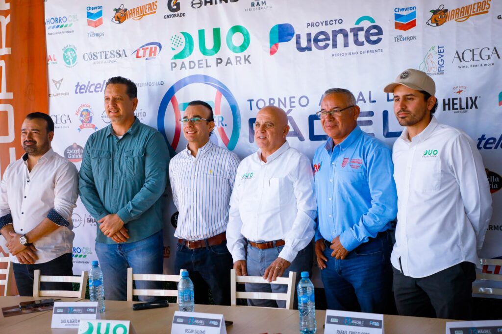 Presentes en la reunión con los medios de comunicación: Erubiel Durazo, director general de la Codeson; Rafael Cruz, titular del IDH; Óscar Salomó, representante de Dúo Pádel Park; Luis Alberto Medina, director de Proyecto Puente; Francisco García, director de OCV Hermosillo; y Rodolfo Urrea, coordinador de logística del torneo.