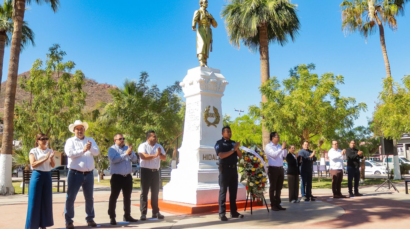 En representación de la alcaldesa de Guaymas, Karla Córdova González, acudió Herman García Luna, Secretario del Ayuntamiento, quien acompañado por el Comisario de Seguridad Pública y Tránsito Municipal, Julio César Cruz Gallegos, colocaron un ofrenda floral al pie del monumento del padre de la patria para después, rendir un minuto de aplausos.