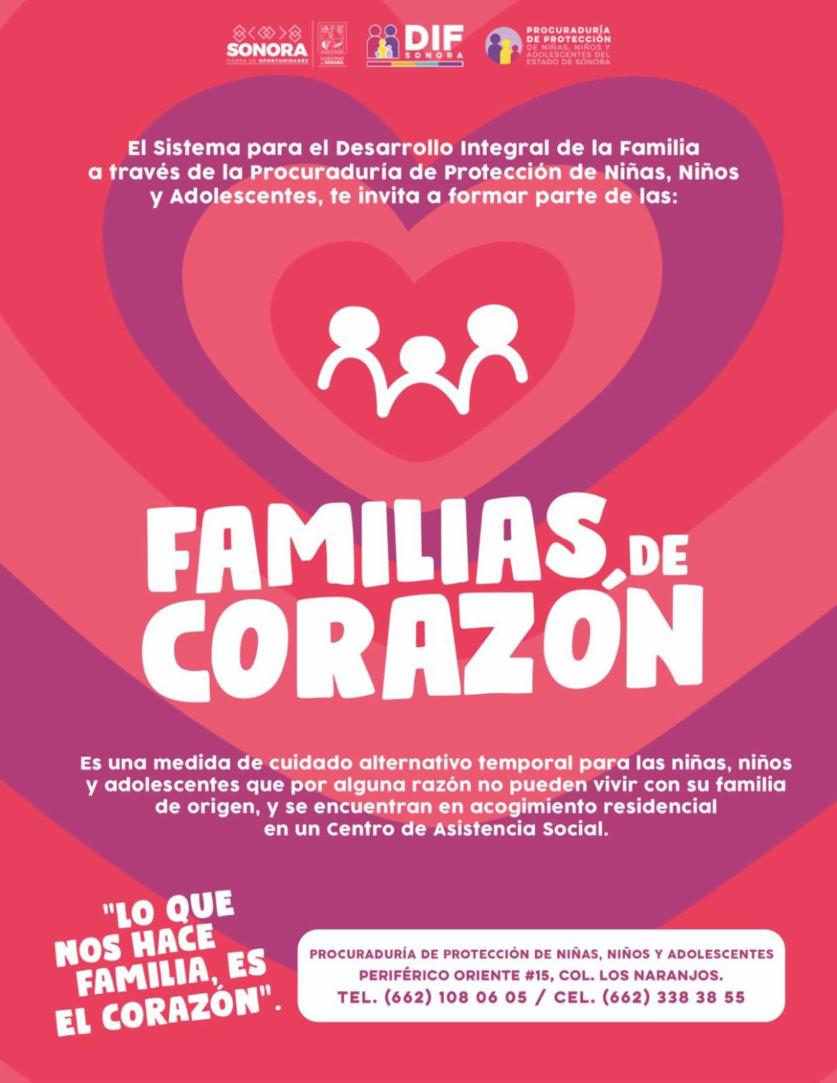 A las personas que tengan interés en participar en el Programa “Familias de Corazón” se pueden comunicar al teléfono (662) 108-06-05, o acudir a las instalaciones de la Procuraduría de Protección de Niñas, Niños y Adolescentes, ubicadas en Periférico Oriente #15, col. Los Naranjos.