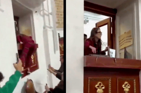 A través de redes sociales se difundieron imágenes de Larios parada sobre una silla de la sala de sesiones y brincando hacia un balcón donde se ubica la cabina de audio.