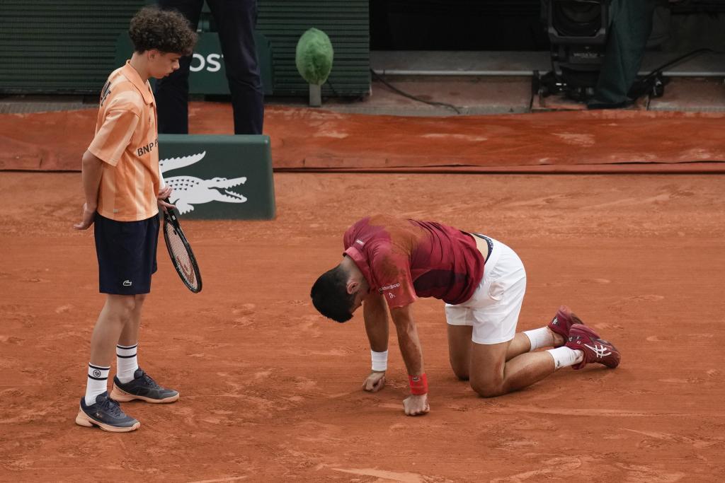 Un recogepelotas auxilia a Novak Djokovic tras sufrir una caída durante el partido de cuarta ronda contra Francisco Cerúndolo en el Abierto de Francia, el lunes 3 de junio de 2024, en París. (AP Foto/Christophe Ena)