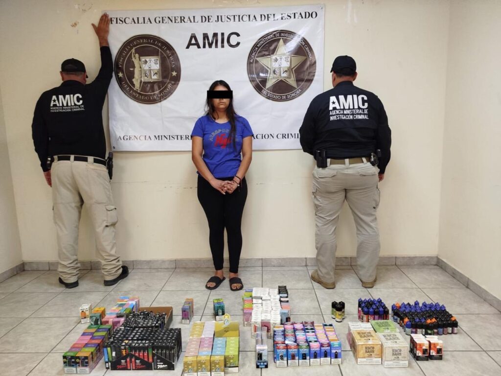 Por otra parte, en San Luis Río Colorado se efectuó otro cateo coordinado en la calle Camelias, en la colonia Mezquite, donde fue detenida Dania Yareli “N”, de 23 años, asegurando en el lugar 524 vapeadores.