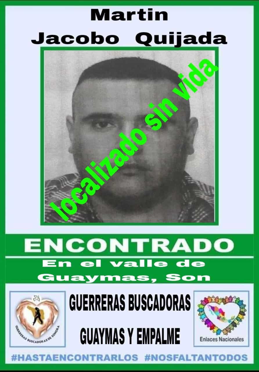 Tras exámenes de genética entregados por personal del Laboratorio de Inteligencia Científica Forense (CIF) se confirmó identidad de Martín Jacobo Quijada, el cual fue localizado en una fosa clandestina en la comisaría de Ortiz en el valle de Guaymas, por parte de integrantes del colectivo ‘Guerreras Buscadoras Guaymas-Empalme’.