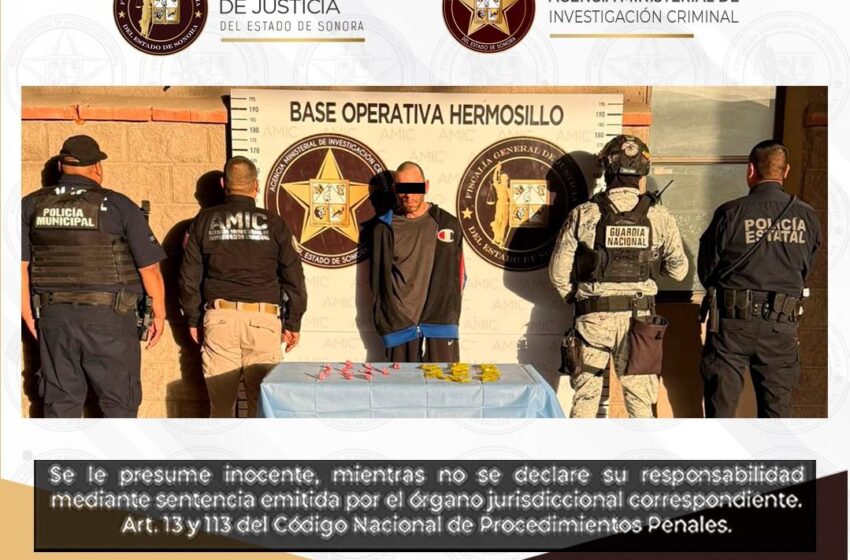 Durante la diligencia fue detenido Carlos Alberto “N”, de 44 años de edad, originario de Hermosillo, Sonora, quien cuenta con antecedentes penales por robo de vehículo y robo con violencia en las personas o cosas; narcomenudeo, por portación de armas prohibidas, abuso de confianza y delito contra la salud.