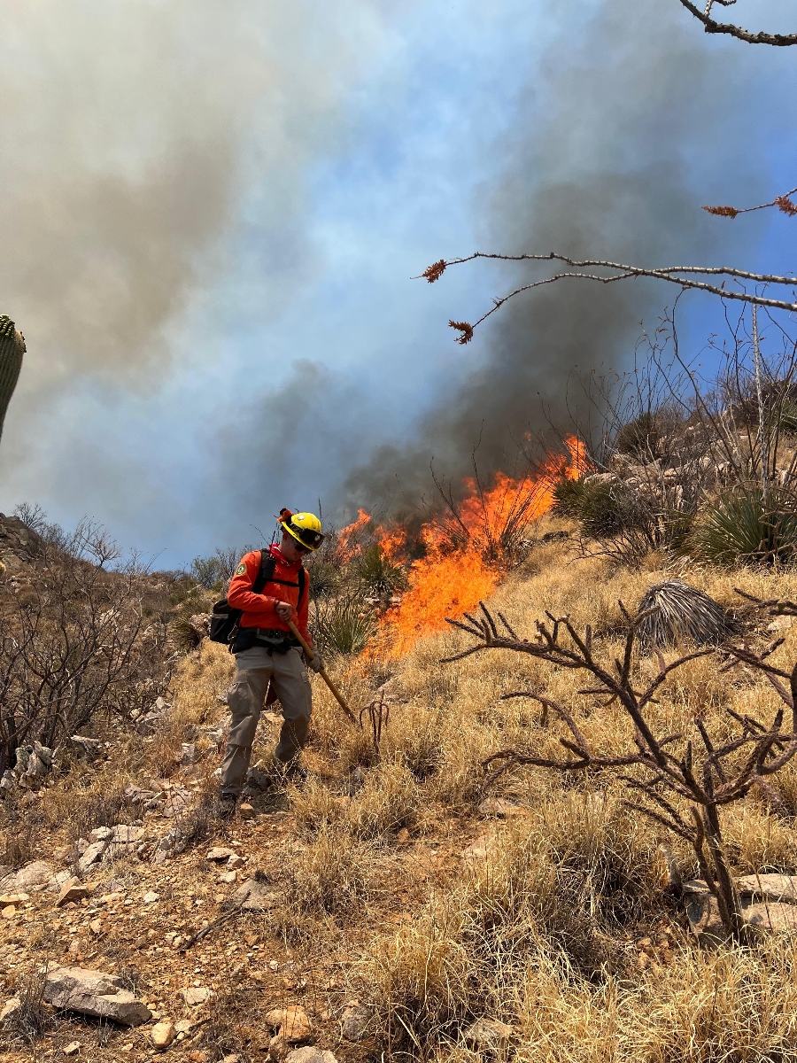 Armando Castañeda Sánchez, coordinador estatal de Protección Civil, destacó la labor coordinada que se realiza durante esta temporada de incendios forestales, con la participación de brigadistas de la Comisión Nacional Forestal (Conafor), la Comisión Nacional de Áreas Naturales Protegidas (Conanp), la Secretaría de la Defensa Nacional (Defensa), Guardia Nacional, la Brigada de Manejo de Fuego de Sagarhpa y Protección Civil Sonora, así como voluntarios y rancheros de la región.