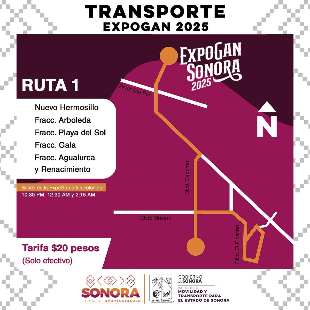 Hermosillo, Sonora.- Con el objetivo de facilitar el traslado seguro y económico de los asistentes a la ExpoGan Hermosillo 2025, el Gobierno de Sonora, a través del Instituto de Movilidad y Transporte para el Estado de Sonora (IMTES), ofrecerá servicio especial de transporte público nocturno del 30 de abril al 25 de mayo.