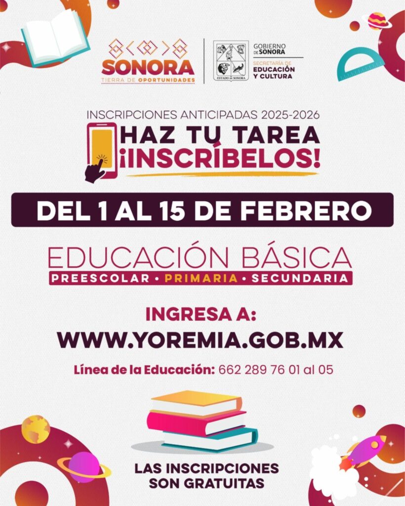 Hermosillo, Sonora.- A través de un proceso ágil, eficiente, sencillo y gratuito se llevarán a cabo en Sonora las Inscripciones Anticipadas para el ciclo escolar 2025-2026, del 1 al 15 de febrero, anunció la Secretaría de Educación y Cultura (SEC).