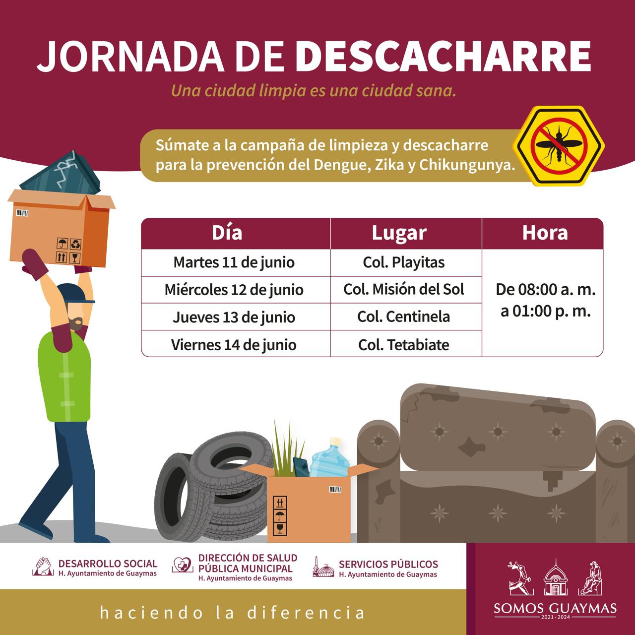 Promueve Ayuntamiento de Guaymas jornada de descacharre; del 11 al 14 de junio en las colonias Las Playitas, miércoles 12 Misión del Sol, jueves 13 Centinela y finalizará el día 14 en Tetabiate.