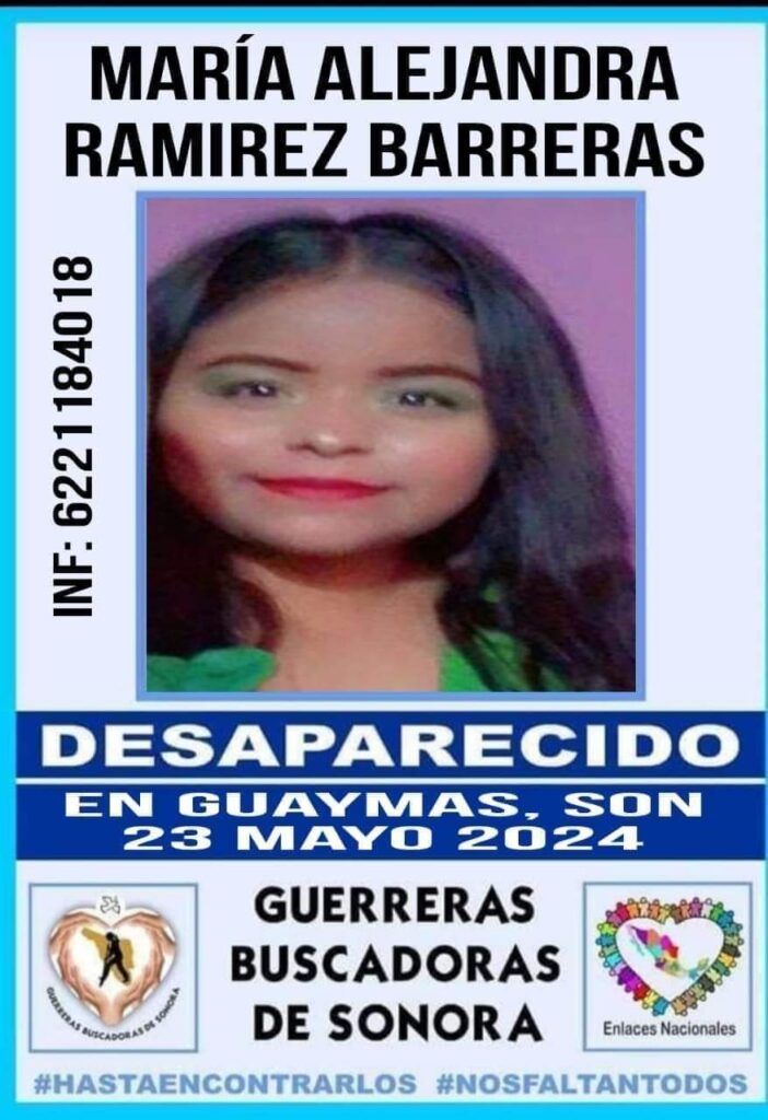 Cintia Gutiérrez, vocera del colectivo Guerreras Buscadoras de Guaymas y Empalme confirmó la activación de una ficha más, al pedir la colaboración ciudadana para la localización de María Alejandra Ramírez Barreras de 20 años de edad.
