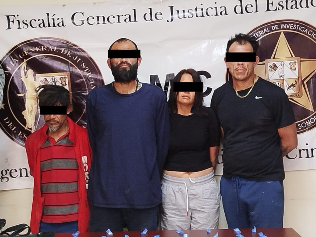 Durante la intervención realizada el pasado 24 de febrero, fueron detenidos Raúl “N”, de 39 años, originario de San Luis Río Colorado; Jorge Isaac “N”, de 43, originario de Sinaloa; Eunice Belinda “N”, de 34, originaria de Ciudad Obregón; y Antonio “N2, de 48 años, originario de Guanajuato.