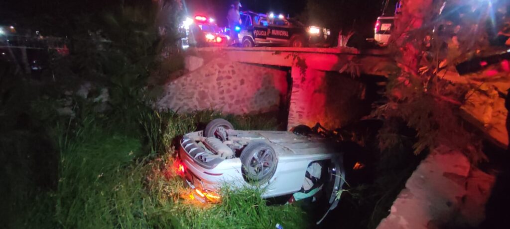 El automóvil derrapó peligrosamente y terminó por salirse del camino y caer bajo un puente, donde quedó finalmente en posición invertida.
