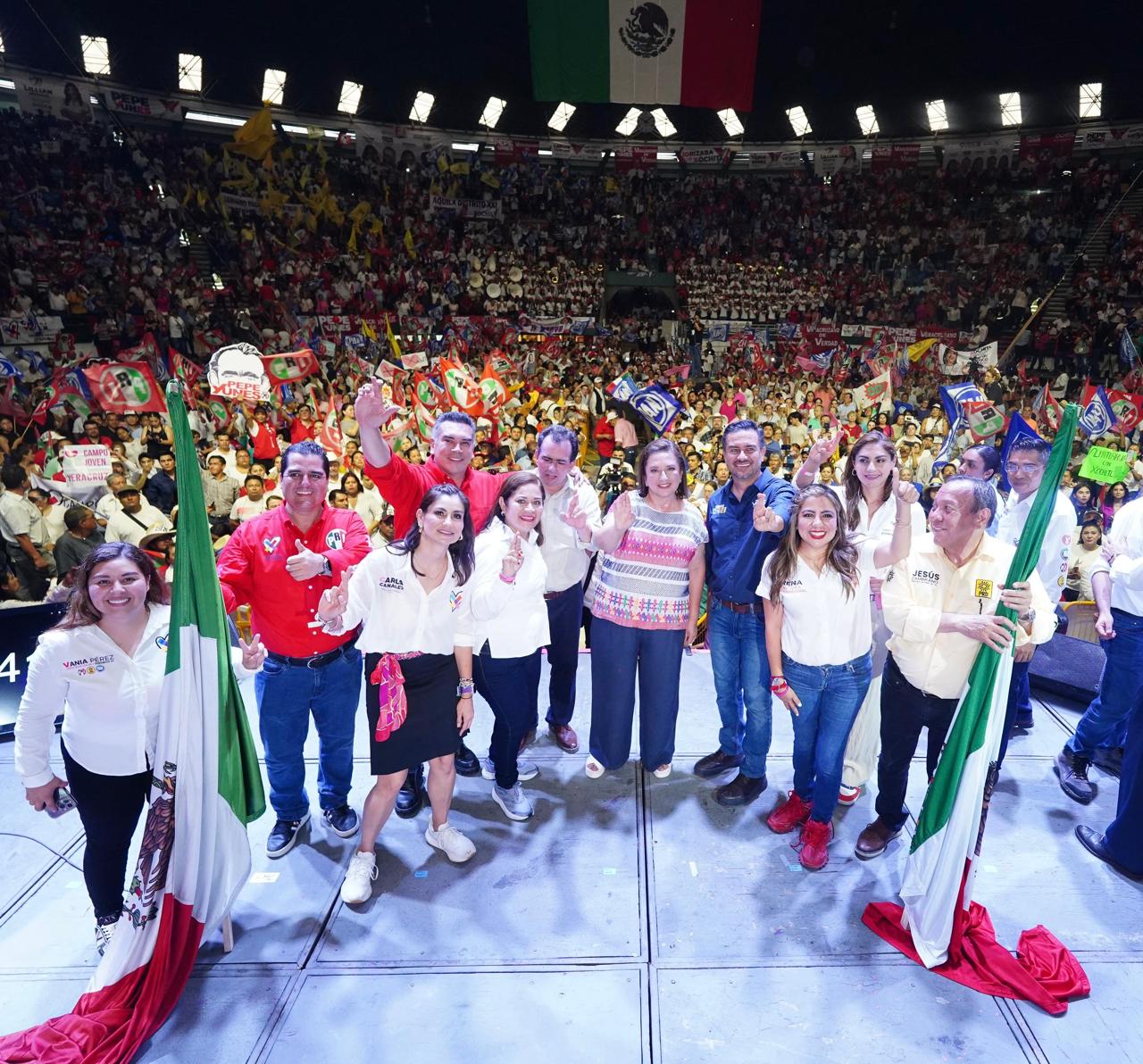 Por la tarde, Gálvez Ruiz se reunió con miles de ciudadanos, militantes y simpatizantes en la Plaza de Toros la Concordia, en Orizaba, Veracruz, donde los llamó a luchar contra el odio y la división que perjudican al país.