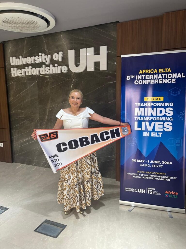 Hermosillo, Sonora.- Con la presentación de una ponencia en la conferencia “Transforming minds, transforming lives in ELT” (Transformando mentes, transformando vidas en ELTA), Raquel Cibrián Valle, docente del Colegio de Bachilleres del Estado de Sonora (Cobach), participó en el Congreso Internacional de Maestros de Inglés, realizado en El Cairo, Egipto.