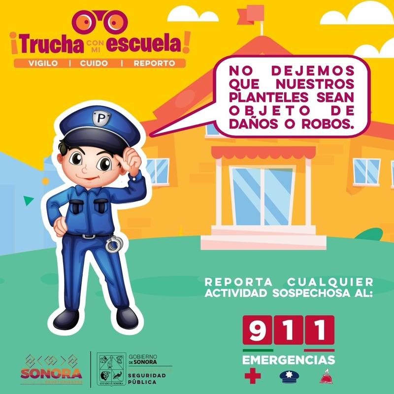 Hermosillo, Sonora.- Para que al regresar de vacaciones las y los estudiantes encuentren sus planteles en óptimas condiciones, elementos de Policía Estatal de Seguridad Pública (PESP) y la línea de emergencias 9-1-1 Sonora, colaboran con el programa “Trucha con mi escuela”.