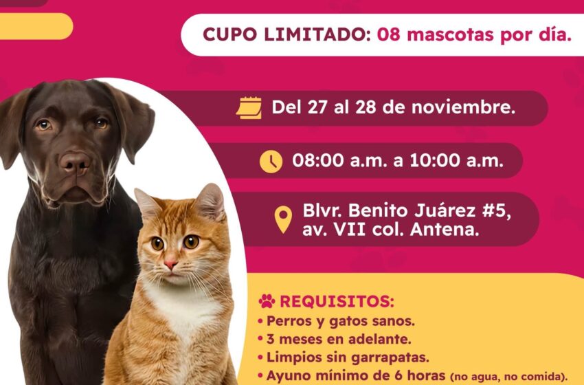 Comentó que las intervenciones se realizarán en el Centro Canino y Felino, ubicado en bulevar Benito Juárez 5, avenida VII, en la colonia Antena, donde el horario de registro será de 8:00 a.m. a 10:00 a.m.