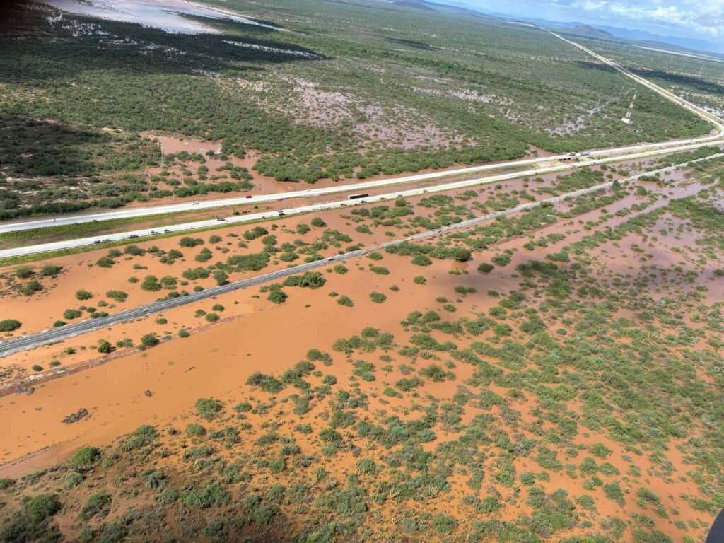 El titular del Ejecutivo Estatal recorrió la zona afectada entre Hermosillo y Guaymas, además de hacer un sobrevuelo en Empalme, donde se detectaron afectaciones por inundaciones en el puente Douglas, el cual requerirá reforzar la estructura y las vías del ferrocarril, ya que obstaculizan el flujo natural de las mareas.