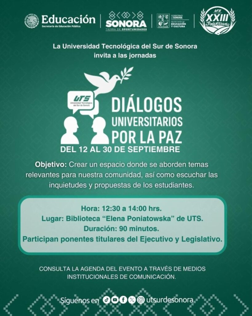 Cajeme, Sonora.- Como parte de los esfuerzos del Gobierno de Sonora para construir espacios de reflexión y diálogo donde se generen propuestas y acciones que contribuyan a la creación de entornos libres de violencia, la Universidad Tecnológica del Sur de Sonora (UTS) convoca a participar en los Diálogos Universitarios por la Paz.