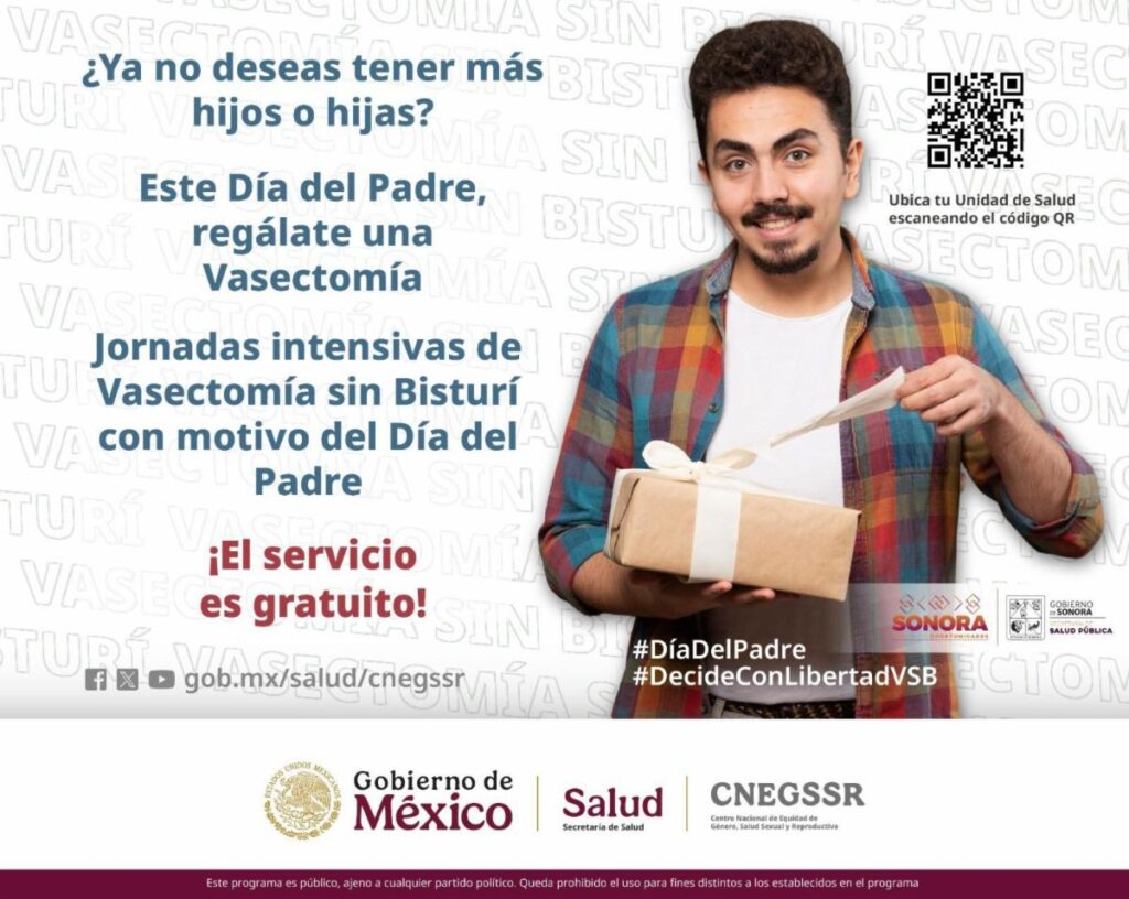 Hermosillo, Sonora.- Con la finalidad de concientizar a la población masculina sobre la responsabilidad sexual, el Gobierno de Sonora, a través de la Secretaría de Salud (SSP), invitó a informarse sobre la vasectomía sin bisturí, una cirugía de mínima invasión dirigida a hombres que no desean tener más hijos o deciden no tenerlos.