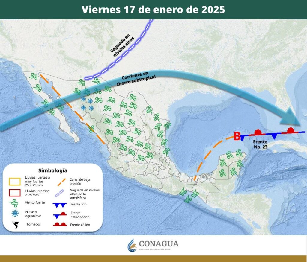 Durante hoy el flujo de la corriente en chorro subtropical que cruza los estados del noroeste y norte del país, en interacción con una vaguada en niveles altos de la atmósfera en el suroeste de Estados Unidos, ocasionará fuertes rachas de viento en las regiones mencionadas. Además, existe la probabilidad de caída de nieve/aguanieve en zonas altas de Sonora durante la madrugada. A su vez, prevalecerá un ambiente muy frío con posibles heladas durante la madrugada y noche con temperaturas mínimas desde los -5°C a -0°C en regiones altas montañosas del norte y oriente, de -5°C a 3°C sobre el norte; de 3°C a 8°C sobre el centro y noroeste; de 4°C a 9°C sobre el sur del estado. Así mismo, se prevén cielos parcialmente nublados con un probabilidad de precipitación mixta sobre el oriente del territorio Sonorense.