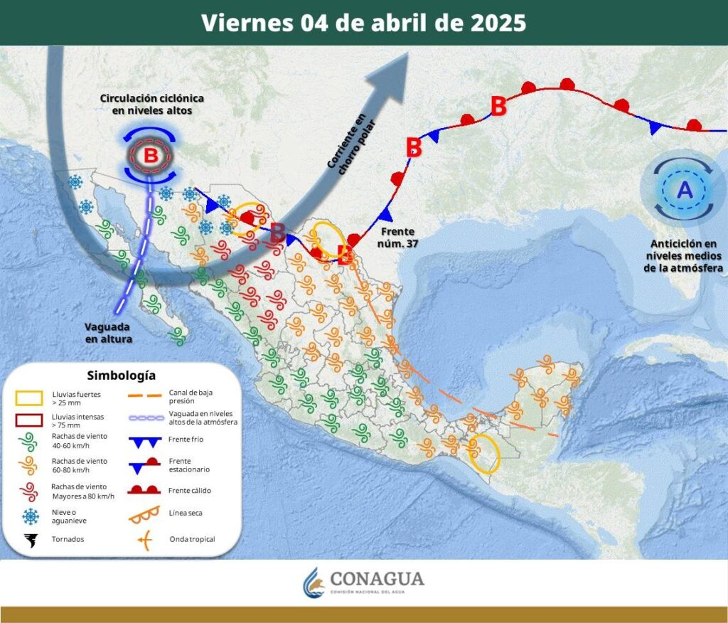 Durante hoy, el frente núm. 37 se mantendrá extendido con características de estacionario sobre el norte del país, continuará interactuando con una vaguada en altura en el noroeste del territorio nacional y con la corriente en chorro polar, ocasionando rachas muy fuertes a intensas de viento con velocidades de 40 a 60 km/h sobre el oriente y 30 a 40 km/h en el resto del estado. También, probabilidad de lluvias e intervalos de chubascos menores a 5mm en las regiones fronterizas del norte de Sonora; además de mantener la probabilidad de caída de nieve o aguanieve en sierras altas de Sonora y Chihuahua.