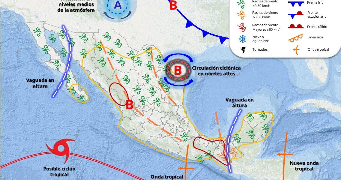 Para hoy, el monzón mexicano en interacción con una vaguada en altura y divergencia ocasionará tormentas eléctricas con lluvias de fuertes a muy fuertes (25 a 70mm) y fuertes rachas de viento (+60 km/h) sobre el sur, centro oriente y noroeste en horario vespertino. Asimismo, se prevé un ambiente de caluroso a muy caluroso con temperaturas máximas entre 40 a 45°C sobre el noroeste y centro de la entidad Sonorense.
