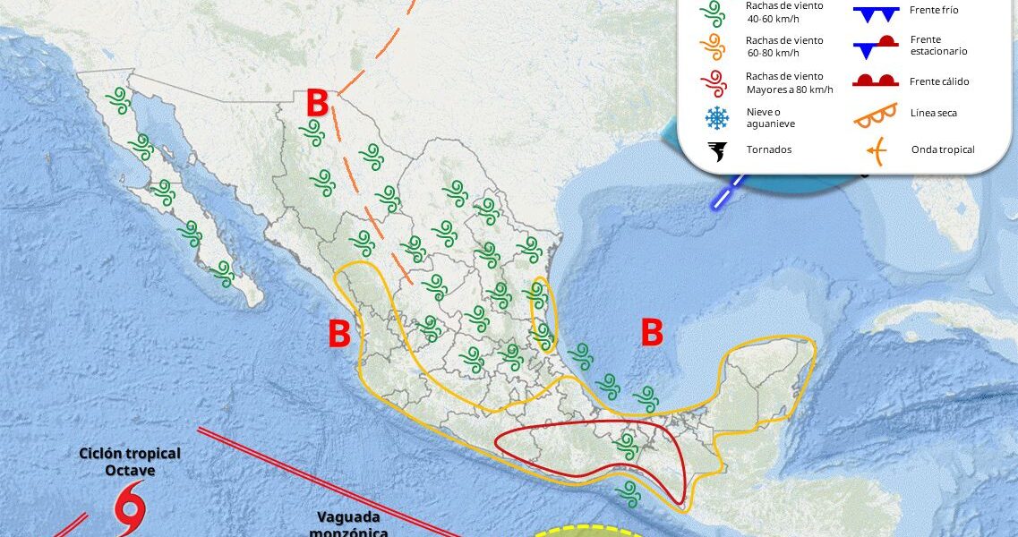 Por otro lado, un nuevo frente frío se aproximará a la frontera noroeste del país durante los días 03 y 04 de octubre, ocasionando rachas de viento moderadas y un ligero descenso en las temperaturas durante el periodo.