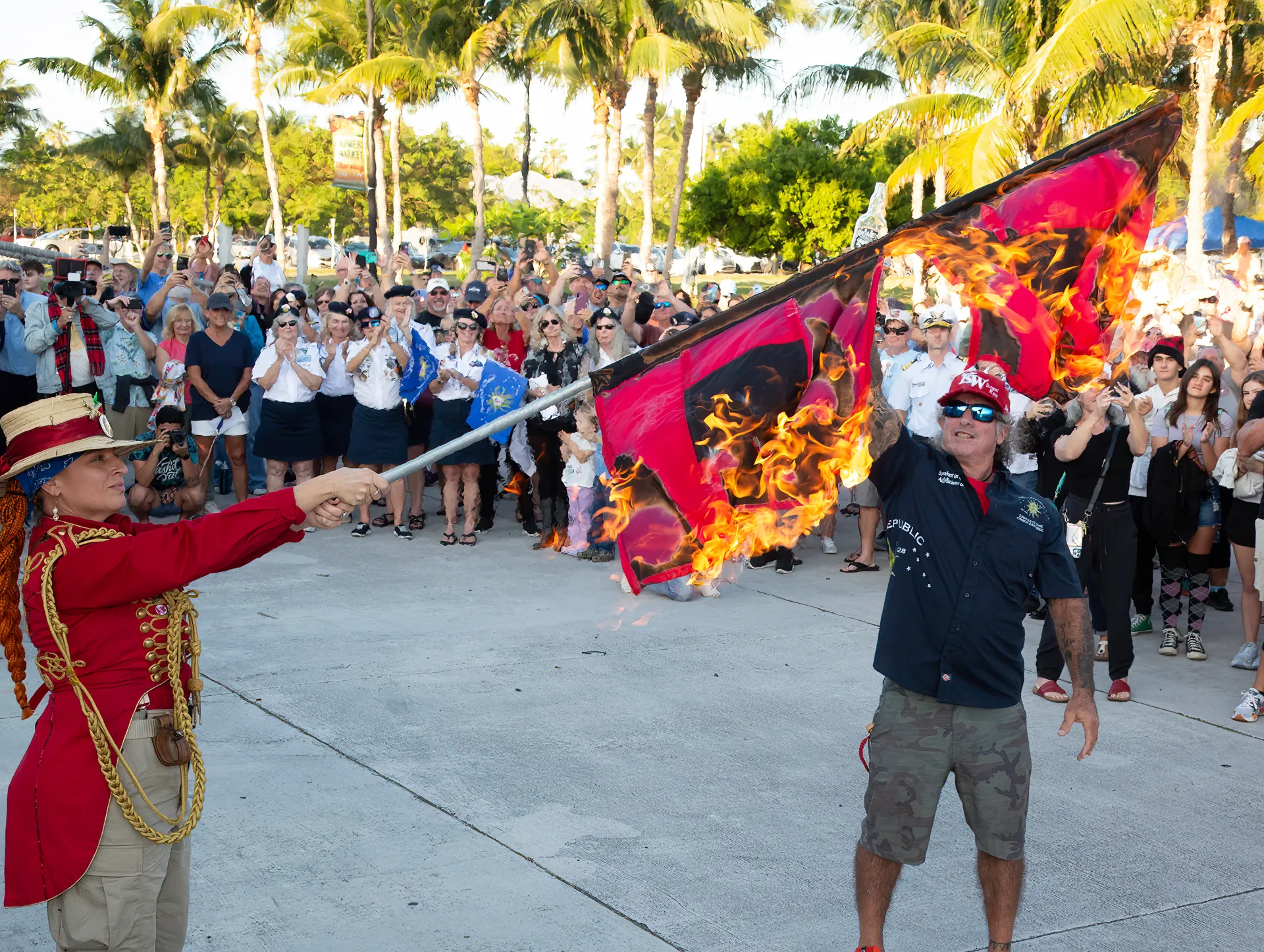 Durante el acto, se agradeció que los Cayos de Florida se hubieran salvado de impactos significativos, pese a que los huracanes Helene, Milton y Rafael causaron vientos de tormenta tropical en algunas zonas antes de tocar tierra en otros estados de EE.UU. Paul Menta y Jai Somers, líderes de la denominada República de la Concha, procedieron a rociar con ron las banderas de advertencia de huracanes y prenderles fuego como parte de la ceremonia.