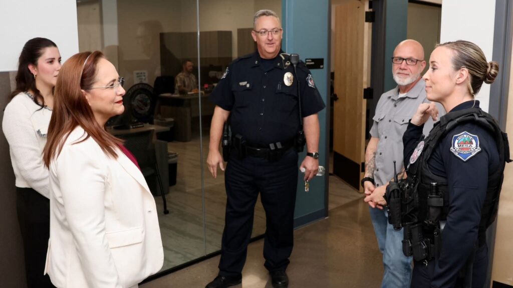 Durante el recorrido por las nuevas instalaciones de la estación de Policía y Bomberos, la comitiva guaymense, encabezada por la alcaldesa Karla Córdova González, fue acompañada por la jefa del Departamento de Bomberos de Mesa, Mary Cameli, y el comandante Chris Rash.