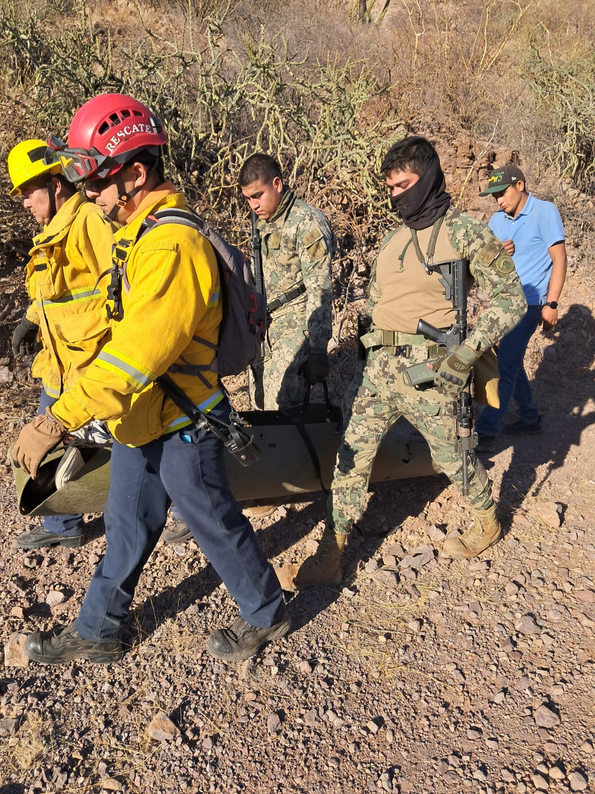 Tras intenso trabajo de más de ocho horas, elementos del Departamento de Bomberos, infantes de la Secretaría de Marina-Armada de México y agentes de la Policía Preventiva, lograron el rescate de una persona del sexo masculino, que resultó lesionado al caer de la parte más alta de uno de los cerros que se encuentra en inmediaciones del sector Fátima.