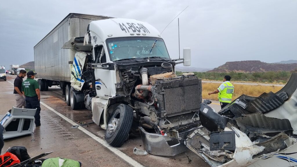 Dos tripulantes de camiones de carga resultaron levemente lesionados, luego de aparatoso choque contra un tracto camión y dompe, donde además se registraron cuantiosos daños materiales entre las unidades motrices, en hechos ocurridos sobre la carretera de libramiento federal Guaymas-Obregón, a la altura del kilómetro 9 durante la tarde de este miércoles 7 de enero.