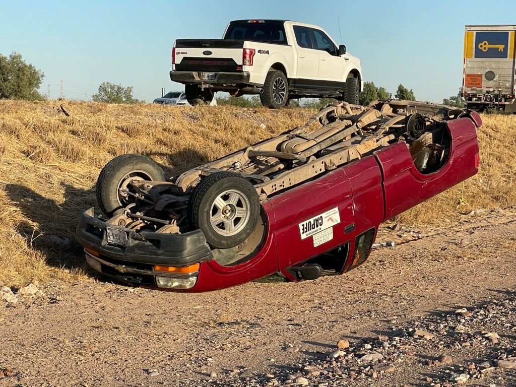 Se informó que alrededor de las 15:00 horas viajaban en un pickup Chevrolet “S-10”, de color rojo y modelo atrasado, el cual sufrió el desprendimiento de uno de los neumáticos posteriores, lo que generó que el conductor perdiera el control de la unidad y terminara fuera del camino, tras dar varias volteretas, quedando con sus llantas hacia el cielo.