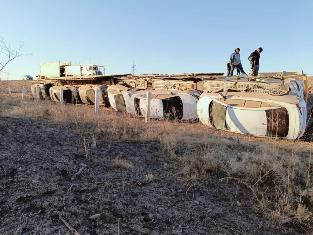Cuantiosos daños materiales en al menos diez automóviles nuevos que eran trasladados en dos góndolas tipo “madrina”, se registraron luego de que se suscitó una salida de camino y volcamiento de un trailer, en hechos ocurridos durante la carretera Internacional México 15, tramo Obregón-Guaymas a la altura del kilómetro 067+500.