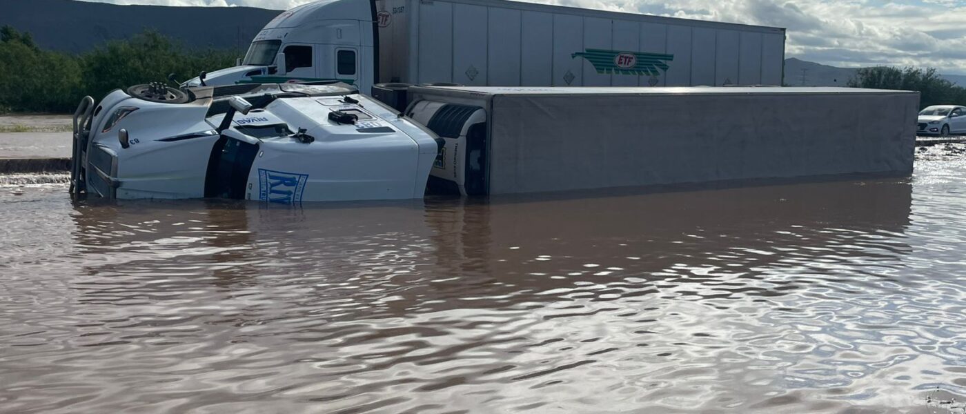 El desbordamiento de un arroyo que provocó que las ‘aguas broncas’ brincarán la carretera Internacional México 15, tramo Obregón-Guaymas a la altura del kilómetro 80, originó la salida de camino y volcamiento de un tráiler, donde su conductor logró salir de la cabina de la unidad y ponerse a salvo.