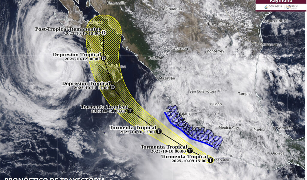 El Servicio Meteorológico Nacional (SMN) advirtió que la tormenta tropical Raymond continuará provocando durante las próximas horas lluvias de intensas a muy fuertes en los estados de Jalisco, Colima, Michoacán y Nayarit, además de oleaje elevado en las costas del Pacífico central.