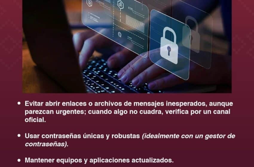 Asimismo, se recomienda no abrir enlaces ni archivos de mensajes inesperados, aunque aparenten urgencia; verificar siempre la información por canales oficiales; utilizar contraseñas únicas y seguras para cada cuenta; mantener actualizados equipos, aplicaciones y sistemas, así como realizar respaldos periódicos de la información importante.